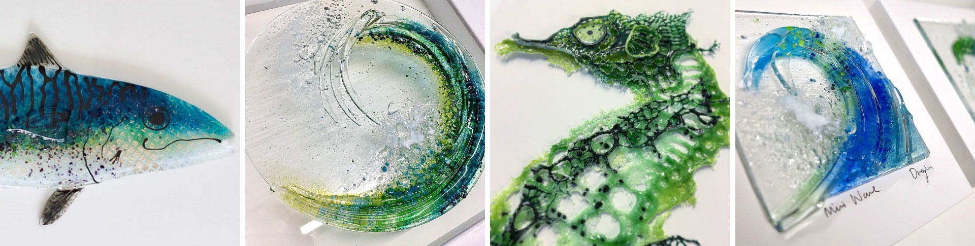 Cornish glass art studio in Newquay, Cornwall offering ocean inspired fused glass wall art, fused glass greeting cards and pocket charms.