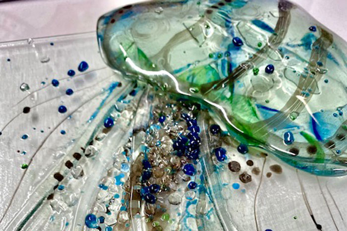 Fused glass work where no two pieces are the same. I use my glass cutter as an artist uses their pencil to record observations and experiences. Cutting & layering glass and using coloured frits, enamels & texture to create something different in each piece. The glass then goes on it’s own unique journey in the kiln, from solid to liquid; hot, melting, slipping and fusing, to cooling to solid once more.